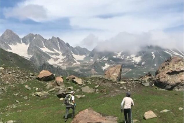Trek through lush meadows with panoramic views of Pir Panjal peaks.